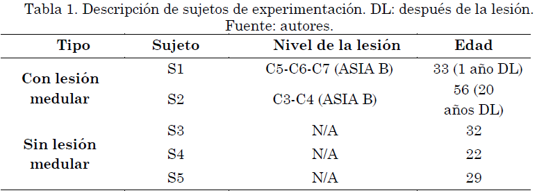 En este estudio se adquirieron segmentos (épocas) de señales EEG asociadas a imaginación de mano cerrada e imaginación de mano abierta de cinco sujetos con edades entre 22 y 56 años, dos de ellos con lesión cervical (S1 y S2) y tres sin ningún tipo de lesión (S3, S4, y S5) (Ver Tabla 1.). De acuerdo con los especialistas médicos, ninguno de los sujetos de prueba presentó limitaciones cognitivas ni daño cerebral que impidiera la participación de los sujetos de experimentación. Asimismo, los sujetos dieron consentimiento informado respecto a las pruebas realizadas y los datos adquiridos.