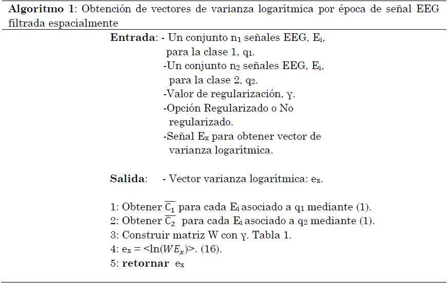 Nótese que dado que 𝑊Ei ∈ ℝN𝖷h, cada componente de ei se obtiene aplicando el logaritmo natural a la varianza de cada canal de WEi, lo que hace que finalmente ei ∈ ℝN. El Algoritmo 1 (ver Tabla 3.) describe el procedimiento para la obtención de un vector de varianza logarítmica para una señal EEG, Ex, filtrada espacialmente.