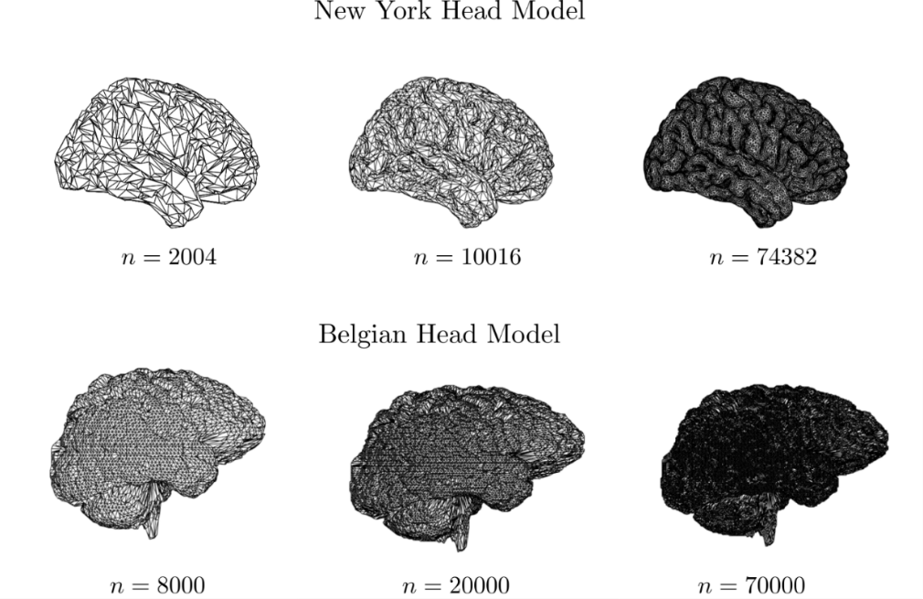 Two high-resolution head models were studied in this work for evaluating the performance of the algorithms in regular and parallel implementations. The first model, named the New York head model, was used with 𝑛 = 2004 (2 k), 𝑛 = 10016 (10 k), and 𝑛 = 74382 (75 k) sources and 𝑚 = 230 EEG channels, as described in [14]. The second model, named the Belgian head model, was used with 𝑛 = 8000 (8 k), 𝑛 = 20000 (20 k), and 𝑛 = 70000 (70 k) sources and 𝑚 = 69 EEG channels. A detailed description of the second model can be found in [14], [15]. A visual representation of both head models with their different numbers of sources is shown in Fig. 1.
