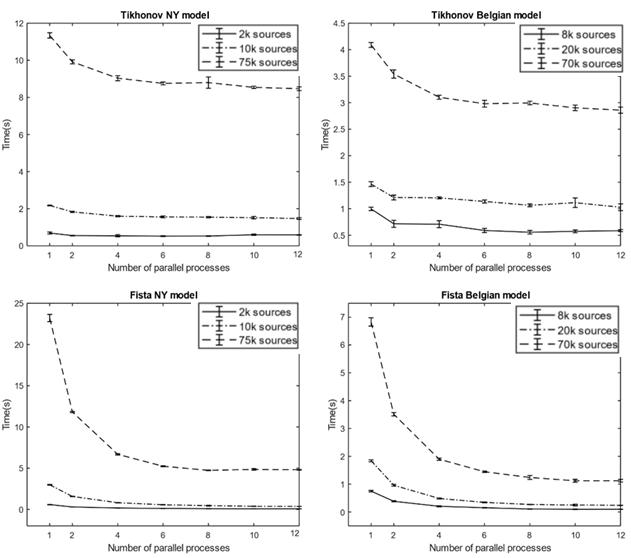 The performance of the algorithms, in terms of computational time, is shown in Fig. 3. In the latter, we notice a monotonic computational time reduction if the number of parallel processes is increased, regardless of the type of algorithm used to solve the inverse problem (namely, FISTA or Tikhonov-like). Moreover, we observe that the difference in the computational times with the three n values (considered when using a single process) is significantly reduced as the number of processes is increased.