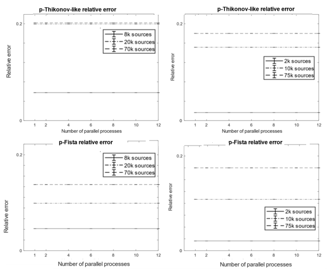 Moreover, to validate whether the parallel solutions deteriorate the source reconstruction quality, Fig. 5 shows the relative error for all the models considered in this work. From such Figure, we can note that the relative error does not depend on the number of parallel processes but on the number of sources of the head model.