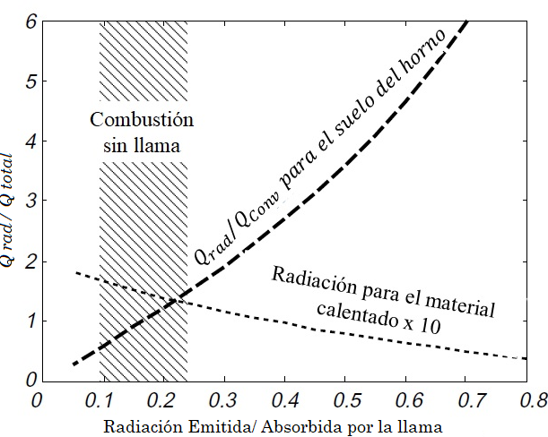 De forma análoga a los procesos de combustión convencional, la transferencia de calor en un sistema que opera bajo el régimen de combustión sin llama se da principalmente por radiación. Sin embargo, el proceso como tal difiere en ambos casos; cuando se tiene un horno operando con combustión sin llama la ausencia del frente de llama luminoso hace que la transferencia de calor por radiación directa, desde la zona de reacción hacia la carga, sea menor que la producida por el modo convencional; no obstante, la radiación incidente hacia la carga es mayor [31], [38]. Esto se debe a que la zona de reacción distribuida y las descargas de reactivos a alta velocidad mejoran la transferencia de calor por convección a las paredes del horno, haciendo que la temperatura en estas sea uniforme, además de que se incrementa el área de intercambio, lo cual facilita la transferencia de calor por radiación desde estas hacia la carga [31].