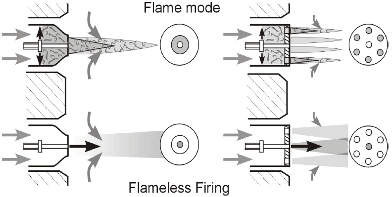 Aunque en un principio para la obtención del régimen de combustión sin llama se pensó que era necesaria la descarga de los reactivos de manera separada, con el fin de que estos se diluyeran antes de encontrarse y de esta forma obtener una zona de reacción distribuida, debido a la baja concentración de O2 en la mezcla tripartita, en los últimos años se ha comenzado a estudiar el régimen descargando de forma mezclada el combustible y el oxidante de manera análoga a una llama de premezcla.
