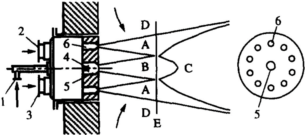 Recientemente Takyu et al. [84] desarrollaron un quemador para combustión sin llama con un método particular para alcanzar el proceso de reacción distribuida, utilizando lanzas de descarga denominadas dinámicas. La invención en la forma de obtención del régimen puede dividirse globalmente en dos partes. La primera consiste en la descarga del combustible y el oxidante de forma concéntrica, generando una reacción primaria; posteriormente la cantidad de oxidante descargada por esta vía comienza a disminuir y se inicia la descarga mediante las dos lanzas dinámicas, que están ubicadas en lados opuestos de la descarga de combustible; la descarga por esta corriente se denomina como oxidante secundario. Finalmente se usa parte del oxidante como fluido de accionamiento para distanciar angularmente la descarga del oxidante secundario de la descarga de combustible. La segunda parte es análoga a la primera, solo que las lanzas están ubicadas en la parte superior e inferior de la descarga de combustible y la porción descargada por estas es menor en comparación con la descargada en la primera parte, lo que hace que las velocidades en este caso también sean menores.