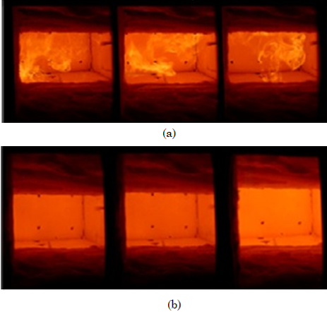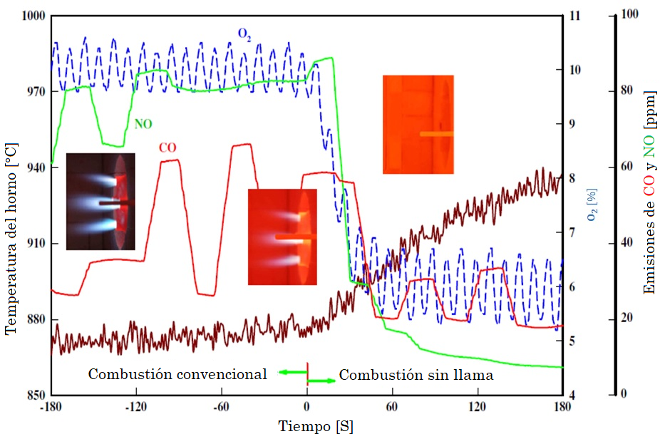 Narayanan et al. [45] llevaron a cabo una comparación entre la combustión convencional y el régimen de combustión sin llama en un horno regenerativo usando C3H8 como combustible y O2 puro como oxidante a una potencia de 200 kW. Se encontró un pico de temperatura menor en 400K para el caso de la combustión sin llama y una mayor producción de hollín en condiciones de combustión convencional asociada con la generación de acetileno producto de zonas de combustión rica. También se evidenció mayor uniformidad, tanto en la temperatura como en el flujo de calor por unidad de área generado por radiación.