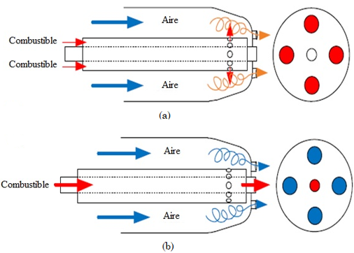 Una vez alcanzada la temperatura deseada se realiza el cambio en el quemador, el cual en el modo de combustión convencional descarga el combustible de forma radial en la cámara de mezclado por donde se transporta el aire; posteriormente la premezcla ingresa en la cámara de combustión, como se muestra de forma esquemática en la Fig.12a.