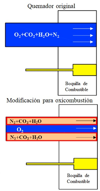 En este sentido, y con el objetivo de tener un efecto sinérgico al combinar oxicombustión con el régimen de combustión sin llama, Xie et al. [56] estudiaron numéricamente un quemador diseñado para este objetivo. El dispositivo es una modificación de un quemador de combustión sin llama, en el que se añadió un coflujo de diluyente a la descarga del oxidante como se muestra en la Fig. 13. La combinación de estas tecnologías se enfoca en poder aprovechar la alta eficiencia de la oxicombustión, evitando la generación de NOx, debido a los niveles de dilución de la combustión sin llama.