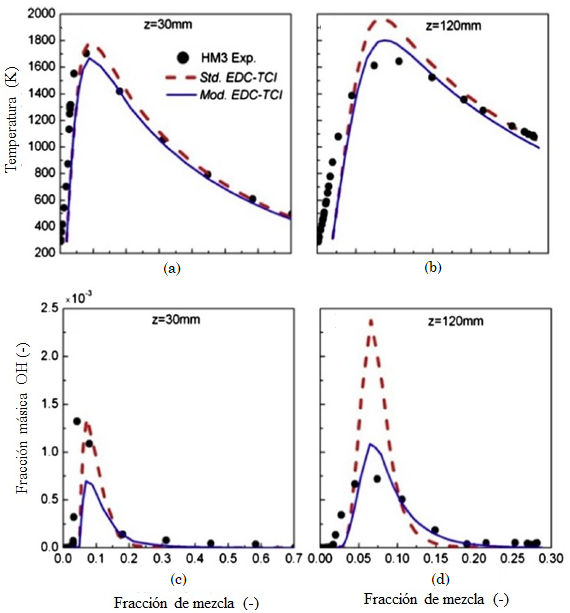 Aminian et al. [75] llevaron a cabo una extensión de este modelo, proponiendo la predicción de la extinción local del proceso de reacción cuando el tiempo de residencia dentro de la estructura donde ocurre el proceso cinético esté por debajo de un valor crítico. Esto permite captar efectos de enfriamiento y extinción antes no tenidos en cuenta, lo que posibilita mejorar la predicción en las especies intermedias y en la temperatura al interior de la zona de reacción en posiciones alejadas de la descarga. Sin embargo, en zonas cercanas a la descarga de los reactivos el modelo extendido no funciona adecuadamente. En la Fig.14 se muestra la comparación del modelo estándar y la versión propuesta, tomando en cuenta el criterio de extinción local. A una distancia de 120 mm de la descarga, la mejora es evidente tanto en la temperatura como en la concentración de OH; caso contrario ocurre a una distancia de 30 mm donde el modelo en su versión estándar predice de una mejor manera los valores de esta especie.