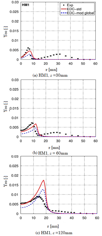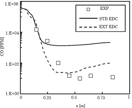 Estos mismos autores, pero en un estudio posterior, evaluaron la versión extendida del EDC en un quemador de biomasa acoplado en un horno de parrilla [79]. La evaluación y posterior comparación con datos experimentales permite establecer una mejora importante en la predicción de la concentración de CO.