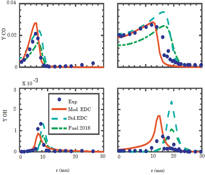 En el caso de los OH el modelo EDC predice de una mejor manera con errores siempre inferiores al modelo flamelet, con una desviación máxima de 42.3% en comparación al 61.3% encontrado para este último; las variaciones hacen referencia a las mediciones experimentales. Un comportamiento similar es reportado para el NO. En el caso del CO el modelo flamelet tiene un mejor desempeño que el EDC, con un error máximo de 16.9% en comparación al 41% entregado por este último.