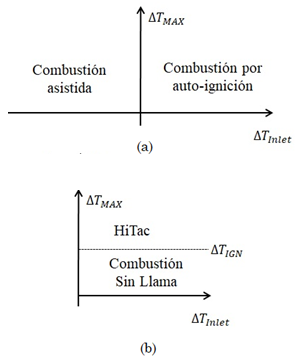 Para incrementos ∆TMAXsuperiores a ∆TIGNo Tsi se tiene una zona denominada de combustión de alta temperatura (HiTac por sus siglas en inglés), mientras que para incrementos menores se tiene la zona de combustión moderada e intensa con bajo contenido de O2, por dilución (MILD por sus siglas en inglés) o combustión sin llama (flameless) [14].