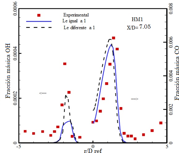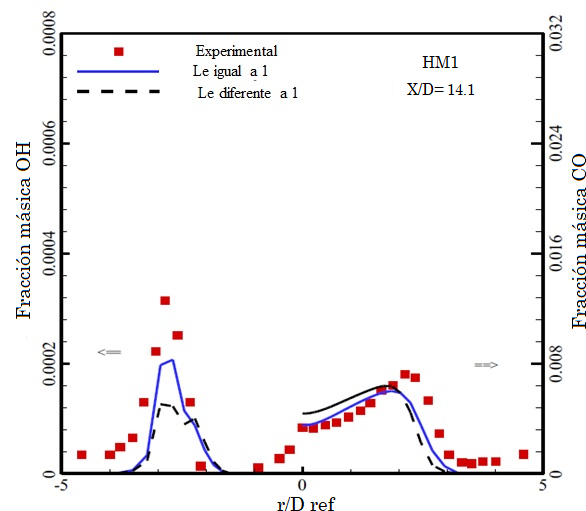 Se evidencia claramente que existe una mejora al variar el número de Lewis en la predicción del OH, aunque en el caso del CO no existe una mejora apreciable. Sin embargo, este resultado es para una posición axial determinada y, de acuerdo con los resultados expuestos por los autores, la mejora no es permanente en cualquier posición como se aprecia en la Fig. 19.