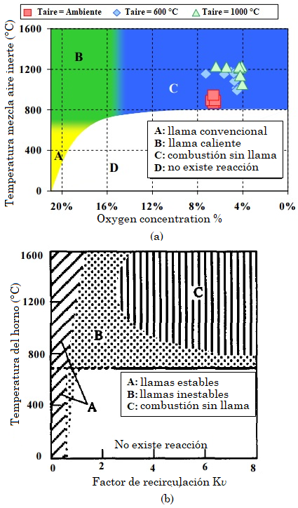 La Fig. 2b muestra los diferentes modos de combustión que pueden obtenerse a partir de una temperatura en el horno y una determinada cantidad de gases recirculados agrupados dentro del factor de recirculación.