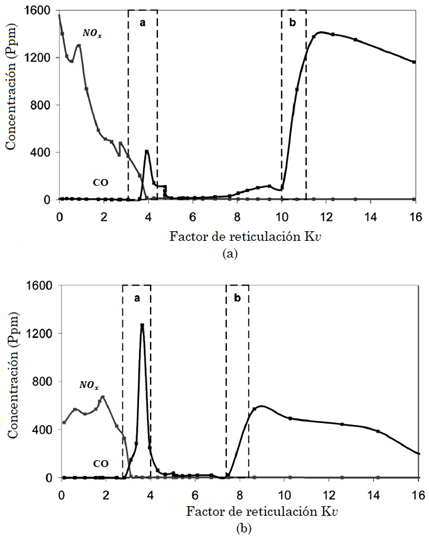 En la Fig. 3 se aprecia la concentración de CO en función del factor de recirculación para un quemador alimentado con gas natural (Fig.3a) y biogás (Fig. 3b). En ambos casos se evidencian claramente dos zonas donde se presentan incrementos abruptos de CO. La primera zona denominada “a” corresponde a la transición del modo de combustión convencional al modo de combustión sin llama, donde se supera el valor mínimo para la recirculación y la cantidad de CO cae para valores mayores, puesto que el régimen se estabiliza. Sin embargo, si Kv se incrementa se llega nuevamente a un punto donde la concentración de CO aumenta considerablemente, zona “b”, producto de lo mencionado con anterioridad: el alto grado de dilución genera la extinción local de la reacción y, por lo tanto, se obtiene una combustión incompleta. Tal como se ha mencionado, la dilución es de vital importancia para la obtención y estabilidad del régimen y esta se obtiene mediante la recirculación generada por los chorros descargados, lo que hace que su velocidad de descarga sea uno de los parámetros más importantes; velocidades de inyección muy bajas no permiten una dilución suficiente y pueden generar que el régimen se sitúe en la zona de transición [23].