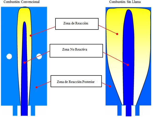 La Fig. 5. muestra un esquema de la zona de reacción convencional y la forma que esta puede tener en condiciones de combustión sin llama, evidenciando el incremento de la misma bajo dichas condiciones. De esta forma se puede establecer que la reacción en el régimen de combustión sin llama se da de forma volumétrica y, por lo tanto, su volumen es mucho mayor al que puede tener el frente de llama de un sistema de combustión convencional. De acuerdo a lo reportado por Yang y Blasiak [25] el volumen de la zona de reacción puede aumentar 13.2 veces cuando la concentración de O2 se reduce de 21% a 5%.