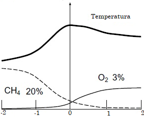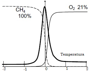 Precisamente, debido a esta reacción distribuida, los perfiles de temperatura y especies que se obtienen dentro del régimen de combustión sin llama son mucho más uniformes en comparación al caso de la combustión convencional. La Fig. 6. muestra un esquema típico de los perfiles de temperatura, combustible y oxigeno dentro de la zona de reacción para la combustión sin llama y la combustión convencional.