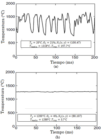 La Fig. 7 ilustra lo mencionado anteriormente, donde se visualizan las altas fluctuaciones de la combustión convencional y la uniformidad temporal de la combustión sin llama. Las posiciones de medición corresponden a la ubicación de la máxima temperatura promedio en cada caso [31].