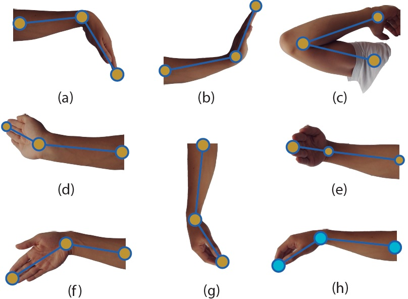 En la Fig. 1, se puede observar la posición final de los siete gestos para los que el usuario manifestó un adecuado grado de comodidad. Es importante anotar que los gestos fueron diseñados bajo la definición de gesto dinámico, es decir, como un movimiento de la mano y no como una pose estática [3]-[8]. Así, todos los gestos inician en la posición de relajación del brazo (h).