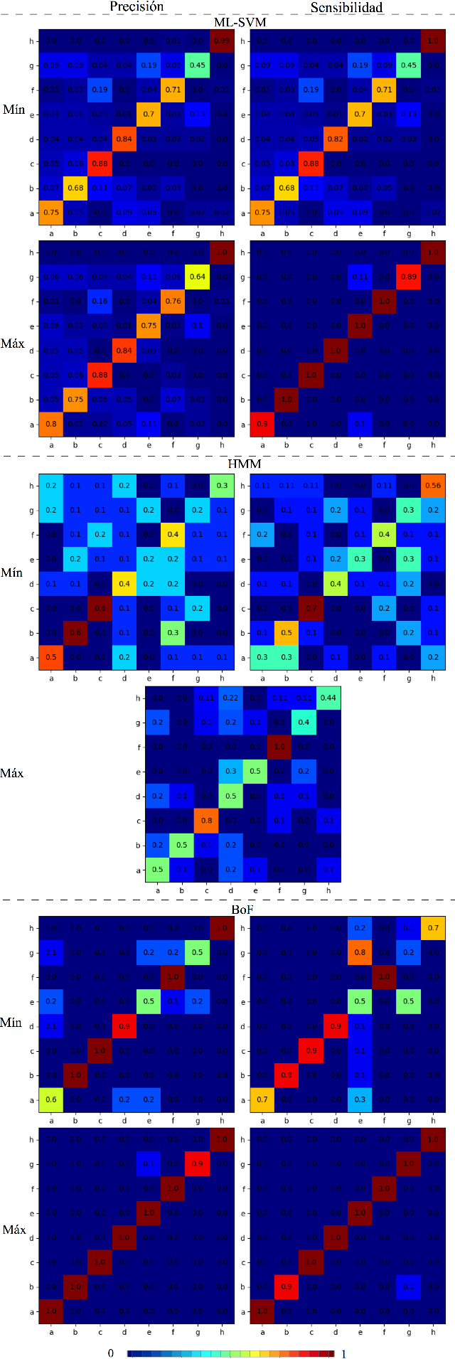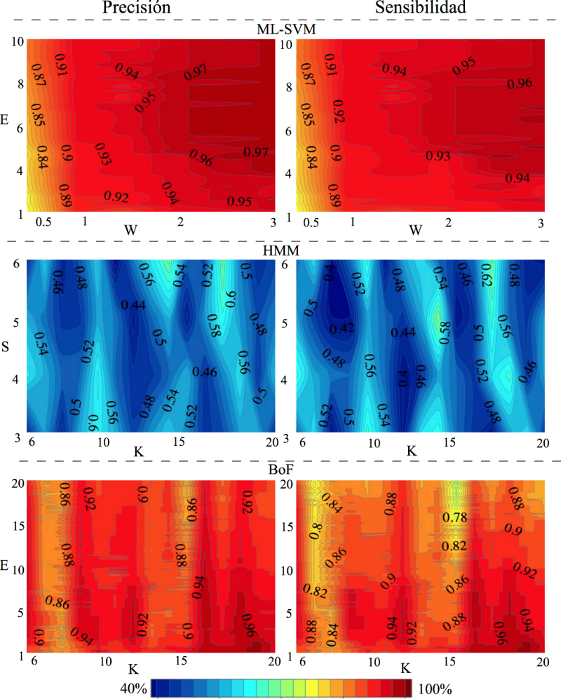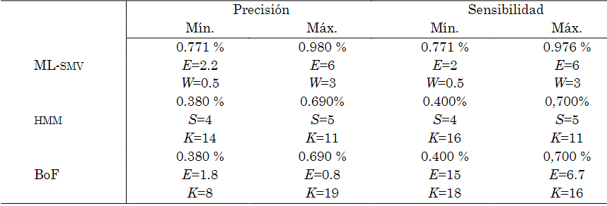 Las columnas muestran los valores máximos y mínimos de sensibilidad y precisión de cada método. Se puede observar que los modelos hmm presentaron el rendimiento más bajo en las dos métricas (precisión 0,38% y sensibilidad 0,4 %) y, en general, el rendimiento promedio menos destacado. El modelo de BoF mostró el mejor comportamiento para las dos métricas, con un valor de precisión de 0,99 % para K = 19 palabras y un E = 0,8 el exponente del kernel polinomial normalizado. Los valores mínimos obtenidos el modelo BoF son superiores al del modelo ML-smv.