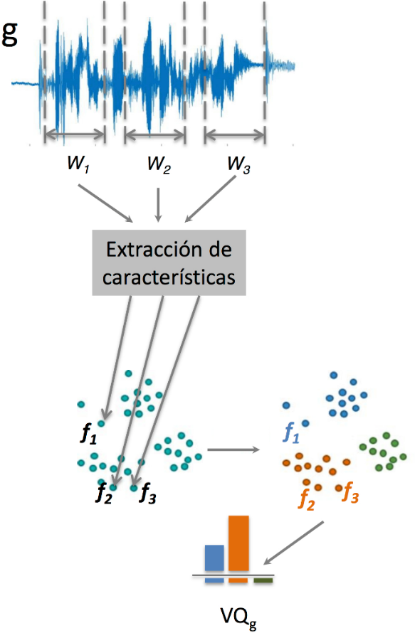 El vector de características fi es calculado a cada ventana. En el ejemplo todo el espacio de características es cuantiado en tres (3) clúster. Así, a cada vector de características se le asigna una membrecía. En este caso, para las tres (3) ventanas deslizantes, se establecieron dos (2) membrecías a la clase naranja, una (1) a la clase azul y ninguna (0) a la clase verde. Entonces, se pude ver que el histograma de membrecías normalizado es el vector de cuantización (𝑉𝑄𝑔).