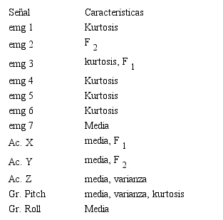 En la Tabla 1 se expone el detalle de las 18 características seleccionadas. Se resalta la presencia de las señales de los siete (7) primeros sensores de emg. Diez de las características seleccionadas provienen de los sensores inerciales, lo cual es coherente con el movimiento amplio de extremidad superior al practicar los gestos.