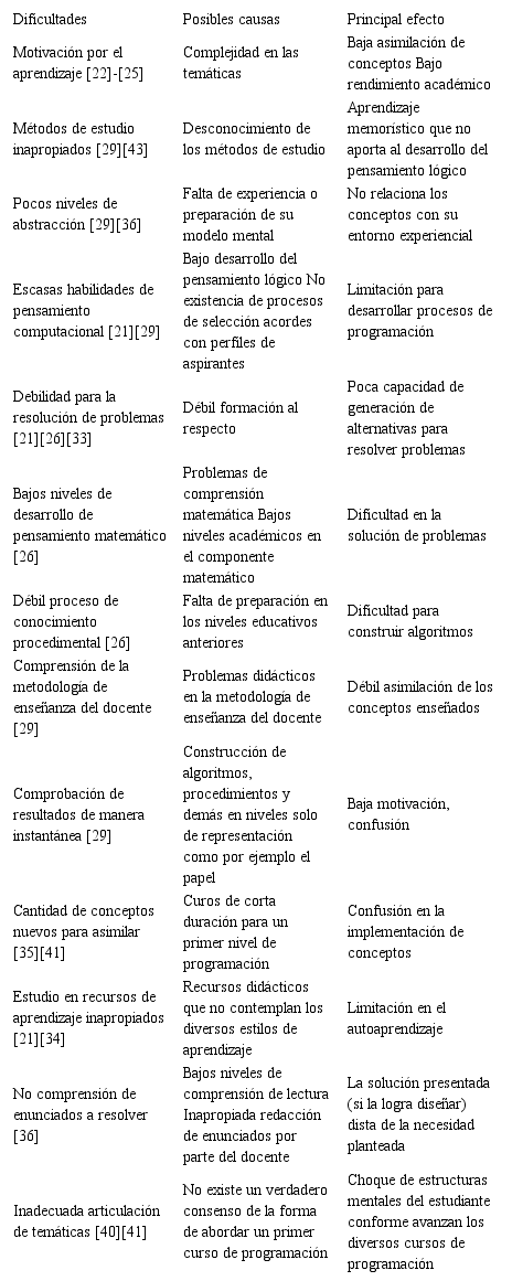 De acuerdo a la revisión sistemática de la literatura en estudio, en la Tabla 8 se exponen los principales hallazgos en torno a las dificultades presentadas por los estudiantes en el aprendizaje de la programación de computadores y el análisis de sus principales causas y efectos.