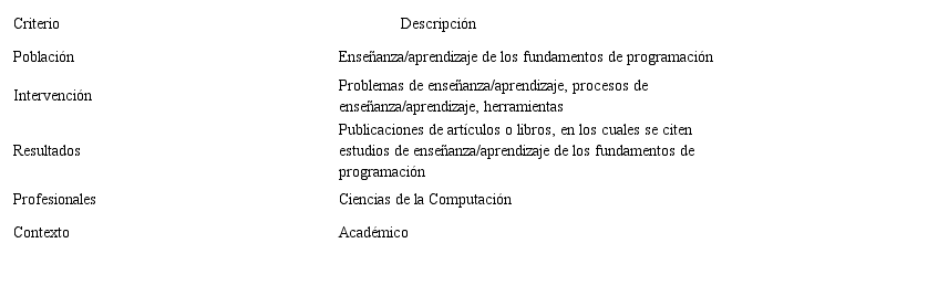 El criterio de inclusión definido es: documento científico relacionado con estudios de procesos de enseñanza aprendizaje de los fundamentos de programación para estudiantes de carreras universitarias o sus sinónimos de búsqueda. De la misma manera, los criterios de exclusión definidos son: estudios que no tengan su correspondiente cita bibliográfica, el documento no contiene los términos o sinónimos de búsqueda, solo experiencias con primeros cursos de programación de computadores y los documentos no están disponibles para descarga.