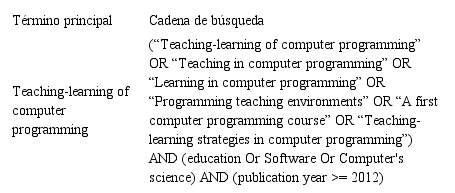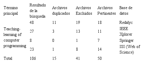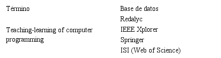 Cabe anotar que la búsqueda planteada se llevó a cabo desde el año 2012, debido a la calidad de los aportes académicos y científicos reportados en los bancos de datos validados por esta misma comunidad, que actualmente son considerados como elementos primordiales en el campo de la enseñanza/aprendizaje de los fundamentos de programación.