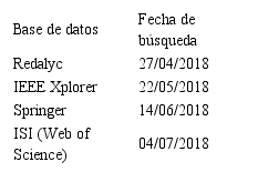 El proceso de búsqueda se adelantó en las bases de datos mencionadas en la Tabla 3, con base en campos como: título, palabras, resumen y documento completo.