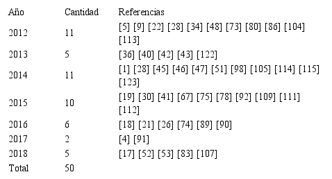 En la Tabla 7 se presentan las referencias de los 50 artículos estudios contemplados en esta revisión sistemática ordenados por su año de publicación.