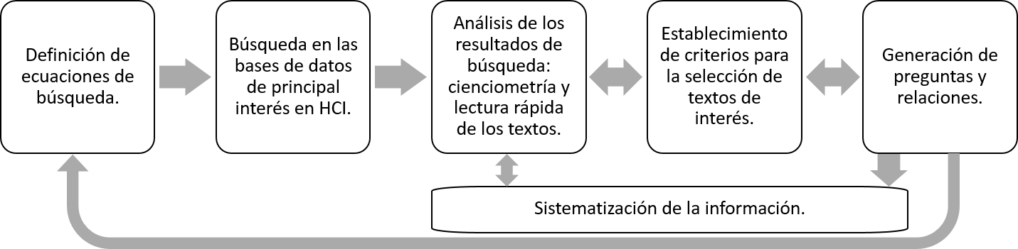 El ordenamiento para la aproximación a los textos fue inicialmente por relevancia, posteriormente, por número de citaciones y, finalmente, del más reciente al más antiguo. La selección de textos para una lectura más detallada dependió de la información encontrada en la primera aproximación, para lo cual se tuvieron en cuenta factores como: conferencia o revista en la que se publicó, relevancia de los autores (número de publicaciones y citaciones), rigurosidad en la descripción del texto en el resumen (por ejemplo, si presenta un método, describe una herramienta, algoritmo, o experimento con usuarios). Adicionalmente, se hizo una búsqueda específica en revistas en español (Faz[27]) y en fuentes de publicación latinoamericanas.