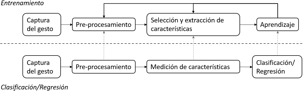Así mismo, exige afrontar nuevos desafíos que se encuentran en todas las etapas del proceso de reconocimiento de gestos, en este texto, comprendido en dos grandes etapas: entrenamiento y clasificación/regresión (Fig. 2)