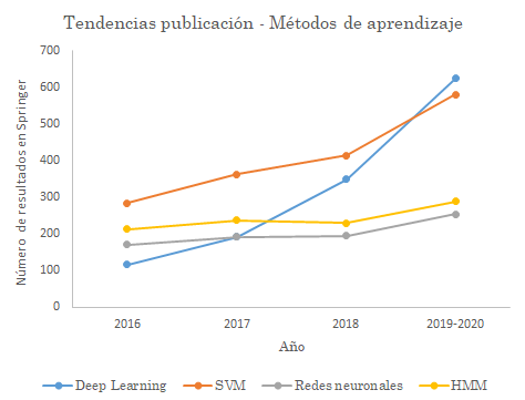 Como indicador se obtuvo la cantidad de publicaciones en las que se mencionara el algoritmo o técnica de clasificación, de acuerdo con las siguientes ecuaciones de búsqueda: i) Deep Learning: Gesture AND (“deep learning” OR “convolutional neural network”), ii) SVM: Gesture AND (“Support Vector Machine” OR “SVM” OR “SVR”, iii) Redes neuronales: Gesture AND “neural networks” AND NOT “Deep” AND NOT “convolutional”, iv) HMM: Gesture AND (“hidden markov model” OR “HMM”).