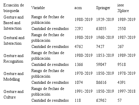 Cuando la búsqueda se filtra por fechas en Springer, se encuentra que antes de los años noventa la mayoría de los resultados obedecen a las áreas de medicina y psicología; pero, a partir de dicha década, se concentran en ciencias de la computación. Sobre los resultados en IEEE y ACM, se observa que IEEE tiene más resultados en temas técnicos: reconocimiento de gestos y modelado de gestos; mientras que ACM arroja más resultados, comparativamente, cuando se incluyen palabras clave más asociadas a lo humano como “interacción” o “cultura”.
