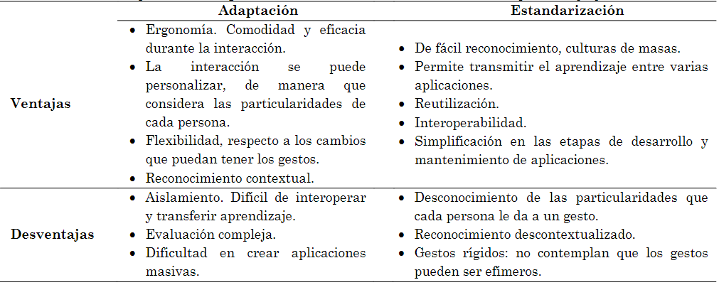 La Tabla 2 presenta una comparación de los dos enfoques, en cuanto a ventajas y desventajas. En ambos casos, la comprensión del gesto es muy amplia y aplica para diferentes partes del cuerpo: estos faciales [33], con las manos [5], [34], [35], con los dedos [4], [5], [20], o de cuerpo entero [8], [36]. En algunos casos, la complejidad técnica de reconocer la secuencia de acciones que definen un gesto ha llevado a que se utilicen objetos que restrinjan la interacción [11], [18].