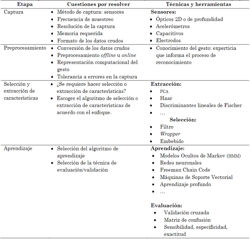 En los dos casos, el proceso de entrenamiento ocurre en cuatro etapas, resumidas en la Tabla 3: captura, pre-procesamiento, selección y extracción de características y aprendizaje. La captura de gestos se suele hacer con diferentes tipos de sensores, entre los que se encuentran: ópticos (cámaras como la PlayStation Eye y cámaras de profundidad como Kinect o LeapMotion) [36], [38], [39]; acelerómetro (SteamVR tracker, Wii Mote); capacitivos (touchpad, pantallas táctiles de dispositivos móviles); giróscopos y electrodos para detección de movimientos musculares (EMG-Myo-, EEG-Emotiv-) [37].