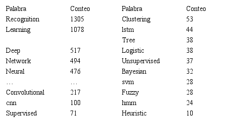 Adicionalmente, se encontró también la existencia de palabras frecuentes como clustering y unsupervised, asociadas a técnicas no supervisadas; o tree y fuzzy, asociadas a árboles de decisión y lógica difusa como técnicas no estadísticas.