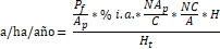 Dónde, Pf= producto formulado kg o Ll; Ap= frecuencia de aplicación; % i.a.= % ingrediente activo; NAp= número de aplicaciones; C= ciclo; NC= número de ciclos; A= año; H= área aplicada; Ht = área total cultivada.