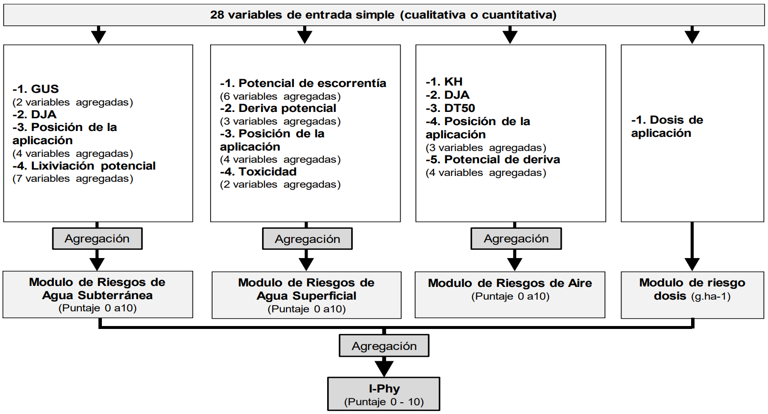 El puntaje se construyó mediante agregaciones sucesivas de 28 variables en cuatro módulos de riesgo, de acuerdo con las reglas de decisión definidas por Van der Werf y Zimmer [7]: agua subterránea (Iphy-subterr), agua de superficie (Iphy-superf), aire (Iphy-aire) y riesgo global (Iphy-global). En la (Fig. 1) adaptada de Le Bellec [2], se representa la estructura del indicador.