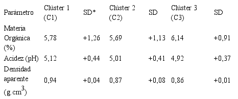Predominó la clase textural franco-arcillo-arenoso en el 73 % de las fincas, con especial significado por la relación del movimiento del agua y retención de humedad. Asociado a este parámetro, la densidad aparente presentó un rango entre 0,70 y 0,94 g cm-3 concordando con Jaramillo [14], quien indica que los suelos andisoles se comportan de forma característica con densidades por debajo a 0,9 g cm-3, y el uso de tractor para la preparación de la parcela podría explicar la variación encontrada entre clústeres.