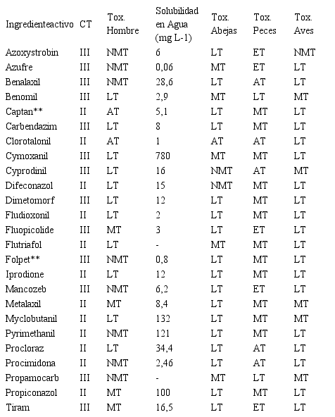 Por el volumen empleado sobresalen los ingredientes activos fungicidas clorotalonil, difenoconazol y metalaxil, todos de categoría toxicológica II, considerados como potenciales agentes contaminantes de agua subterránea y degradación lenta (Tabla 2).