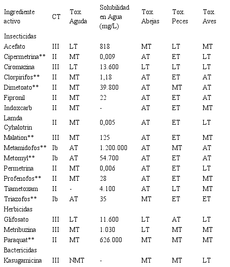 De igual forma, los ingredientes activos insecticidas fipronil, cipermetrina, dimetoato, lambda cialotrina y clorpirifos de categoría II de toxicidad y el metomil catalogado dentro del grupo Ib (muy peligroso) presentaron una elevada frecuencia de aplicación en las fincas (Tabla 3). Estas moléculas muestran prominente movilidad en el suelo, potencial contaminante de agua subterránea y todas son altamente tóxicas para las abejas, peces y aves [16].