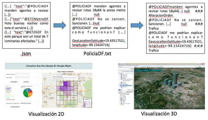 En primer lugar, se recogieron de forma paralela tweets de dos formas diferentes a, través de las funciones que proporciona el api Stream de Twitter. Con base en la idea que se planteó —identificar las quejas de los usuarios de México D. F.—, se recopilaron de forma genérica todos los tweets localizados dentro de las coordenadas que cercan la ciudad de México D. F., mediante la opción que nos proporciona la función post statuses/filter, llamada “locations”.