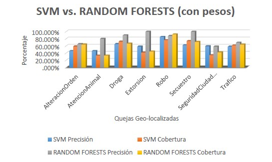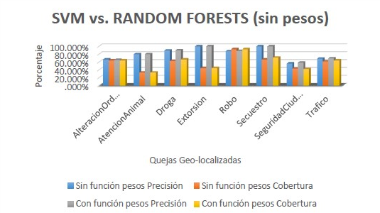 En este caso, se han empleado estos clasificadores de forma diferente. svm se probó con one-vs-one y distintos tipos de kernel, aunados a la función pesos y Random Forests, con 150 árboles aleatorios; asimismo, la función pesos fue usada para identificar ocho clases diferentes de quejas en usuarios específicos.