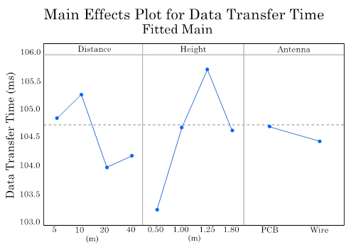 The experiment consisted of three factors; two of them had four levels, and the other one had two levels (422 factorial design). The purpose of the experiment was to find the best combination of factors to maximize the RSSI and minimize data transfer time.