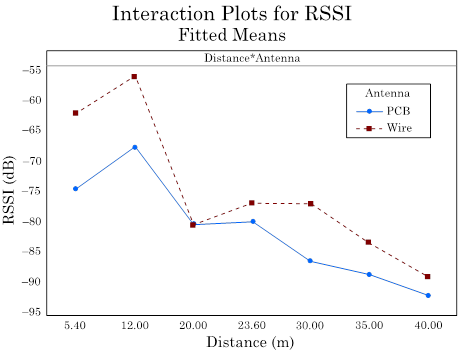 Finally, the least influential parameter on the RSSI output value was the height of the node with respect to ground; the effect of this parameter was weak either individually or in combination with the type of antenna. This does not mean that the height of the antenna with respect to ground does not influence the variation of the intensity of the received power; it means that its effect is less strong than that of the other factors. In our analysis, we also found that, at heights above 1.25 meters, the change in the intensity level is not significant because, when the height of the antenna is exceeded, the ground effect on the signal decreases drastically. These values have a confidence level of 95 % (α = 0.05).