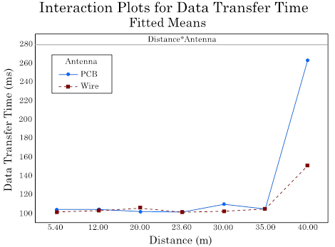 The second most significant effect on data transfer time is produced by the combination of the 3 factors. Finally, the factor with the weakest effect on data transfer time is the type of antenna because the intensity of the signal does not affect the time. As expected, data transfer time is affected mostly by the distance and the multipath delay between the XBee modules. (Fig. 9) illustrates the relationship between each factor and data transfer time.