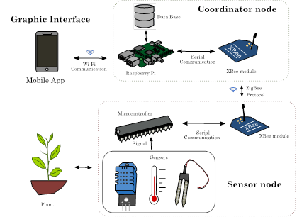 This optimized the irrigation cycles of the crop [11]. In turn, Sung et al. [12] analyzed, monitored, and controlled environmental variables that influenced the development of a plant. They implemented a Wireless Sensor Network (WSN) with XBee modules, Seeduino Stalker cards, and sensors to measure temperature, environment and soil humidity, air quality, and light. In the tests, plants were exposed to two different types of radiation: sunlight and artificial illumination. The physical development of the plant was compared with that of another plant of the same species to which the supervised control of environmental variables had not been applied [12].