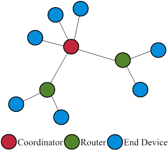 In the figure, End Devices are blue; Routers, red; and the Coordinator, green.