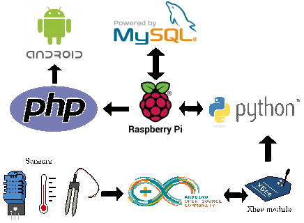 The Raspberry Pi 3 model B has an interpreter for Python programming language. We developed an algorithm in Python for processing and storing the data coming from the XBee modules. The database, where the data are stored, requires the Structured Query Language, which is interpreted and organized by the database manager MySQL. To develop a service that allows queries through Web ports, the PHP non-interpreted language was used. This service enabled us to post GET queries to the database and allowed the responses to be interpreted and schematized by the Android Mobile App.